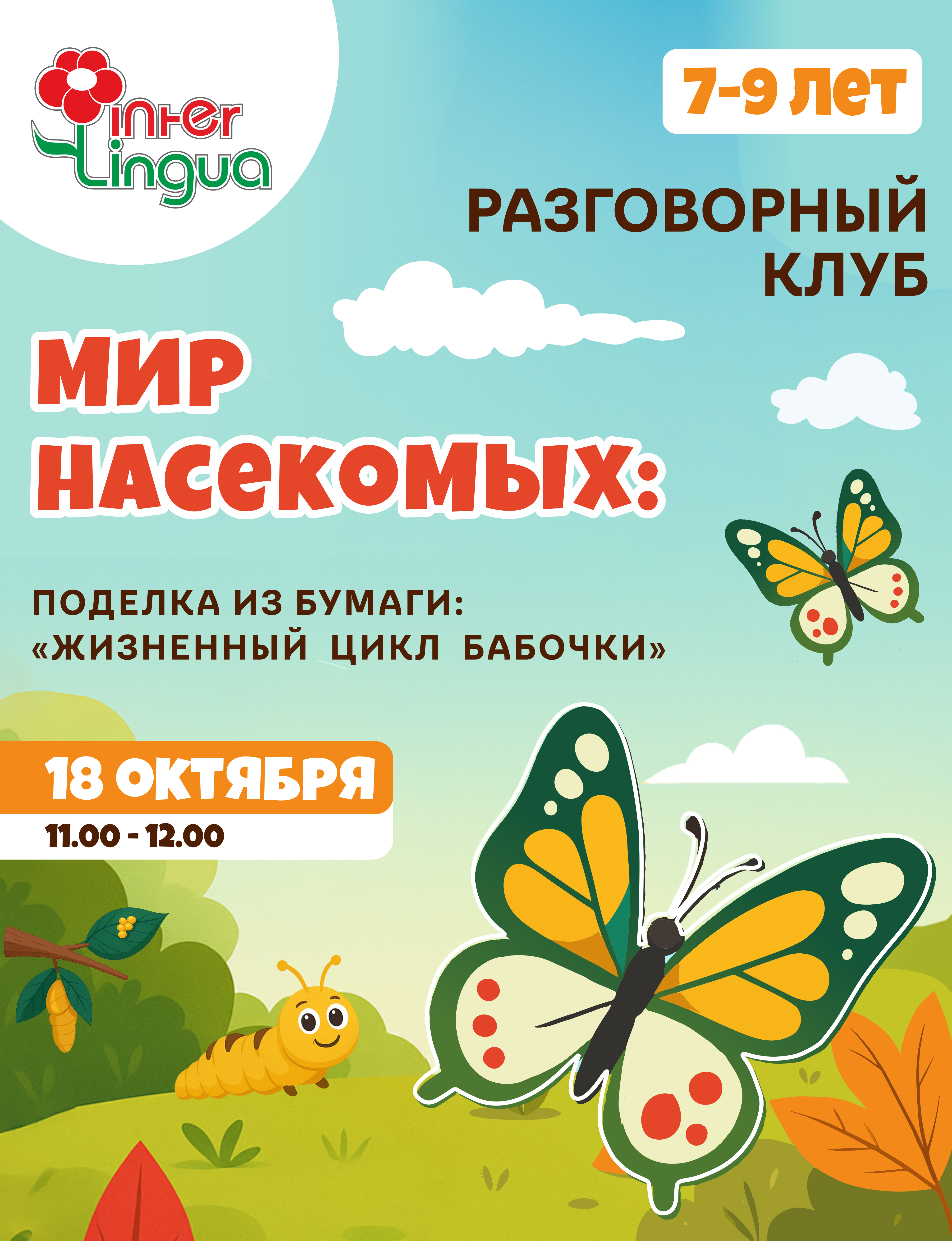 А игровая форма, поможет ребятам запомнить новые слова и выражения. Все материалы будут предоставлены. Продолжительность: 1 занятие, 60 мин Стоимость занятия: 600р. Очно по адресу: Конева, 4а | 18 октября![]() 18 октября приглашаем детей 7 – 9 лет окунуться в мир насекомых. Ребята узнают о жизненном цикле бабочки, расширят свой английский словарный запас, выучат названия цветов, разовьют мелкую моторику и творческое мышление. А наглядная поделка в виде бабочки позволит не забыть важную информацию. Приходите и убедитесь сами, что изучать окружающий мир на английском можно с настоящим удовольствием! Все материалы будут предоставлены. Продолжительность: 1 занятие, 60 мин Стоимость занятия: 600р. Очно по адресу: Конева, 4а |