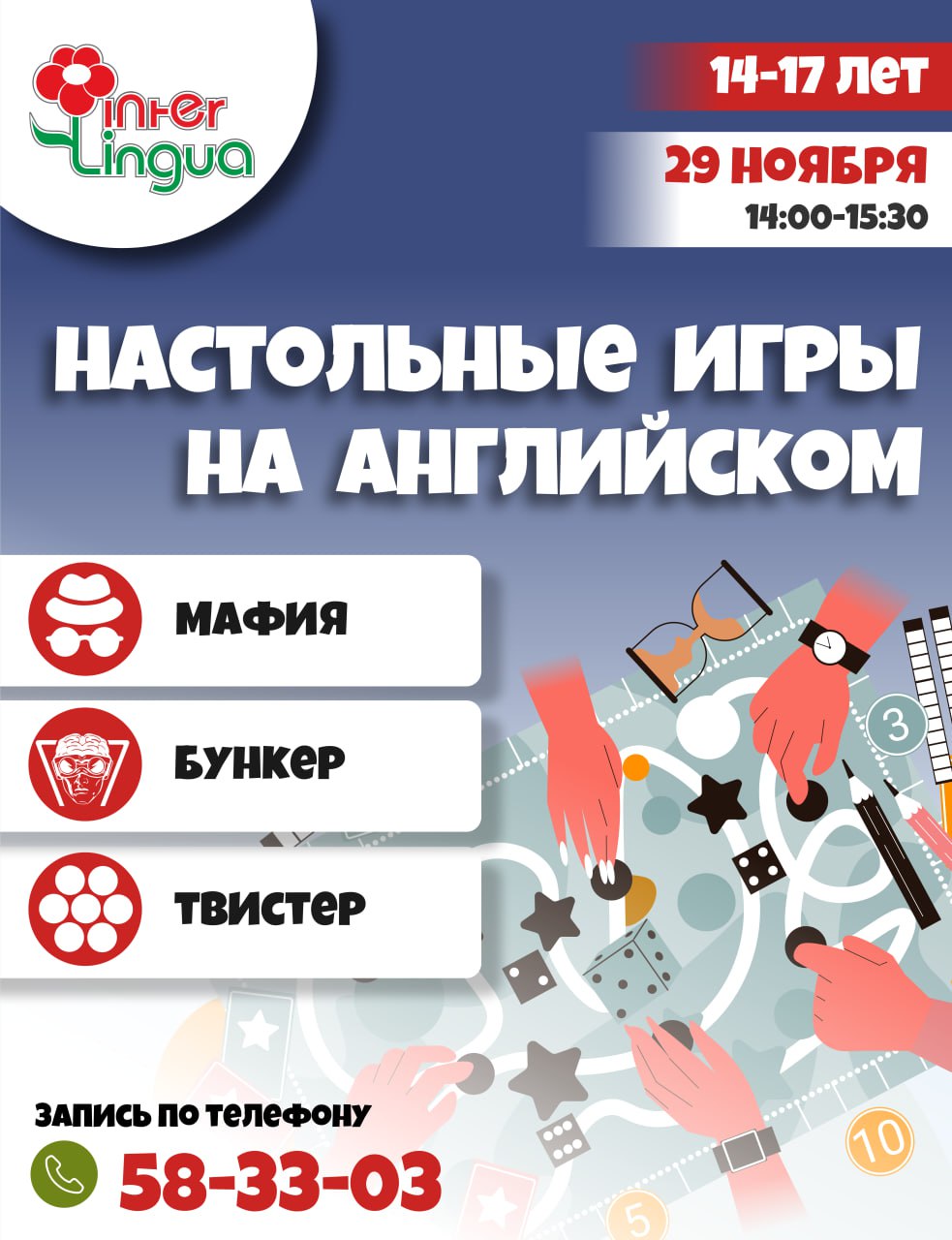 Ждём ребят 14 -17 лет, от уровня B1 (Intermediate) 29 ноября - весело провести субботу и поиграть в настольные и подвижные игры. Ребятам предстоит проявить смекалку и провести детективное расследование в игре «Мафия», приводить доводы, чтобы остаться в убежище в игре «Бункер», а также проверить свою физическую подготовку в игре «Твистер» и ВСЕ ЭТО ИСКЛЮЧИТЕЛЬНО НА АНГЛИЙСКОМ. Почему стоит присоединиться: Это реальная практика общения с носителем языка. Можно услышать живую речь, фразы и произношение из первых уст. Каждый участник окунется в атмосферу тайн и интриг, почувствует себя и детективом, и спасателем, и мафией. Встречаемся в 14.00! Наставник клуба: Джой Онуоха Место проведения: ул. Конева д. 4а Стоимость участия: 600 руб. Количество масок за столом и мест в бункере ограничено, успевайте записаться/