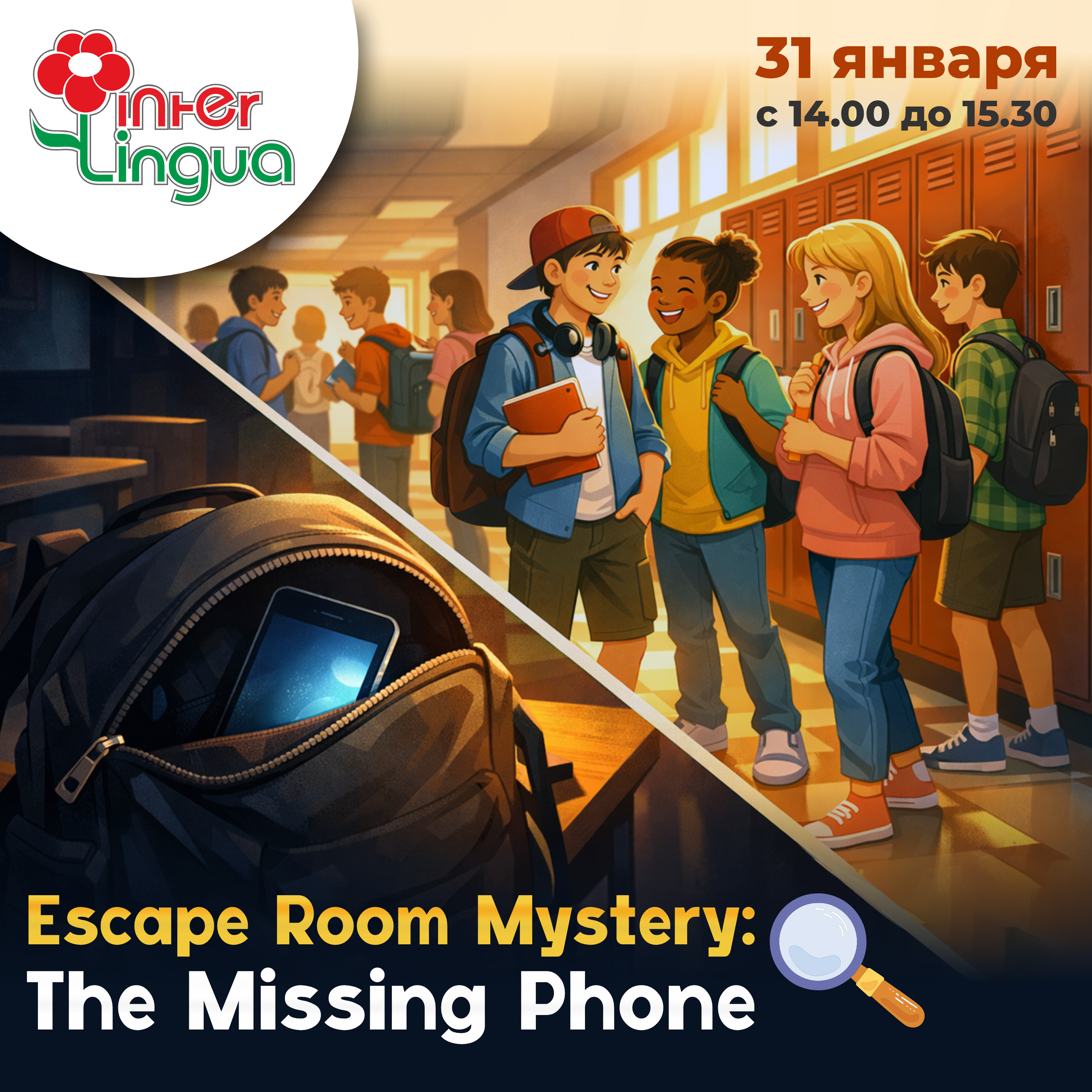 31 января собираем команду лучших умов для разгадки самой настоящей детективной истории. Под прицелом — расшифровка сообщений и паролей, опрос подозреваемых и разбор улик! Почему это полезно? - Всё общение — только на английском языке. - Практика живой беседы: задаём вопросы и обсуждаем разные темы в увлекательной форме. - Прокачка грамматики. - Развитие разговорных навыков и пополнение словарного запаса. - Удовольствие от процесса и атмосфера командной работы. Ближайшая встреча — 31 января, 14:00 – 15:30 Преподаватель: Джой Онуоха Стоимость занятия: для учеников Школы - 510 руб.; для гостей 600р. По адресу ул. Конева д. 4а Раскроем пропажу телефона популярного блогера вместе. Подробнее о курсе в видео от преподавателя Уникальность нашего разговорного клуба заключается в подборке самых актуальных тем, использованию всем известных настольных и интерактивных игр. Темы занятия специально подбираются для подростков 12 - 17 лет и учитывают их интересы и публикуются в наших социальных сетях ВК и Телеграм в афишке на каждый месяц. На занятии преподаватель использует разные виды совместной работы детей: групповые дискуссии, ролевые игры, работа в малых группах, настольные и интерактивные игры. | |