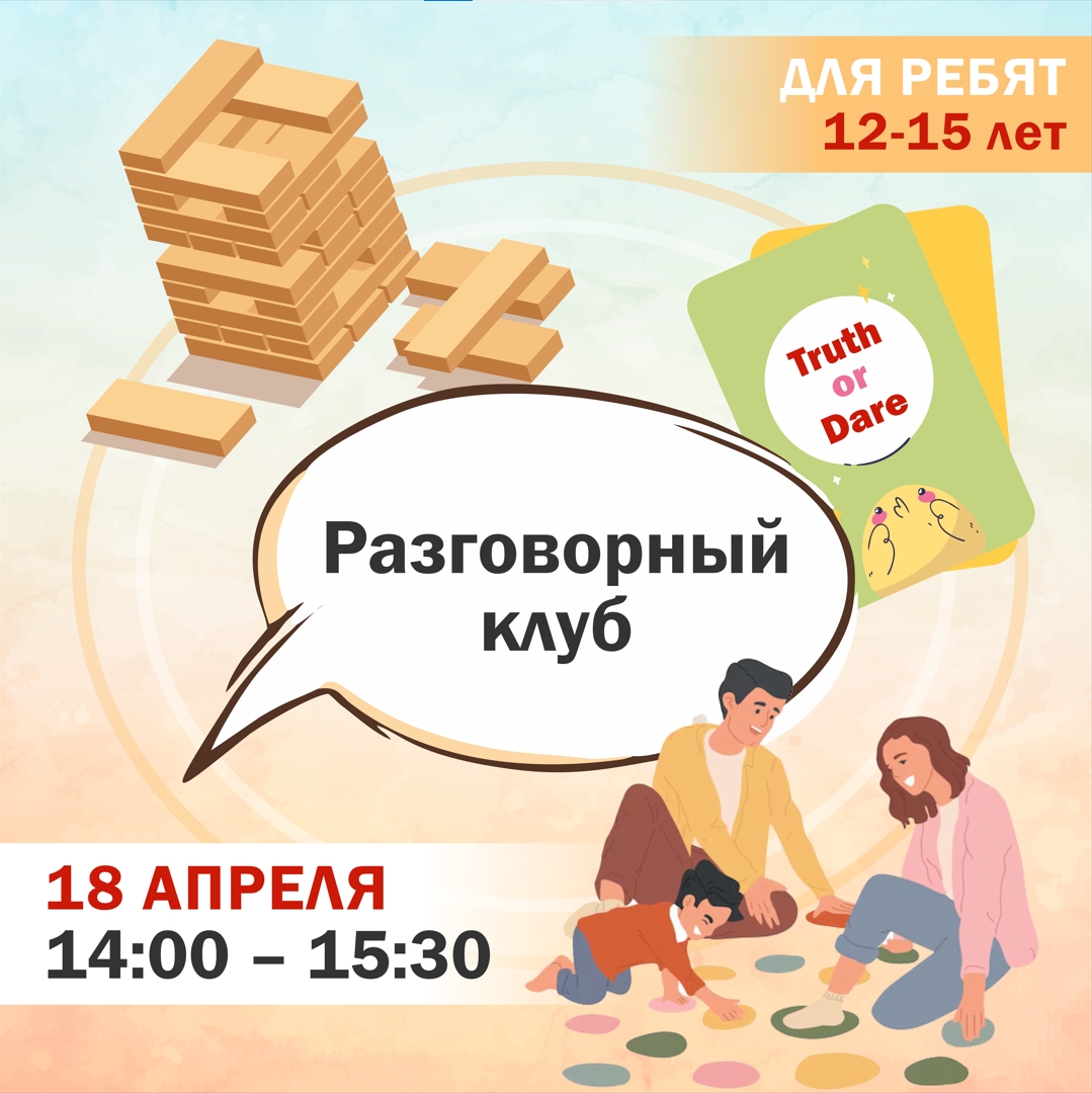 18 апреля — зажигательный день в игровом клубе «Интерлингва»! Приглашаем ребят 12–15 лет с уровнем английского А1 (элементарный) — А2 (ниже среднего) окунуться в мир весёлых игр на английском языке! Никаких сложных тестов — только игры, смех и общение! Что в программе? - "Правда или действие" — для тех, кто не боится весёлых вызовов! Главное правило - не стесняться! Отвечаем на веселые вопросы и выполняем смешные задания. Каждая игра — это мини‑тренировка: общение, объяснение правил, обсуждение ходов и разбор результатов. Встреча — 18 апреля, 14:00 – 15:30 Преподаватель: Джой Онуоха Стоимость занятия: для учеников Школы - 510 руб.; для гостей 600р. По адресу ул. Конева д. 4а Запись по тел.: +7 (4722) 58-33-03 или напишите нам в Telegram , МАХ | ![]() ![]() ![]() ![]() ![]() |