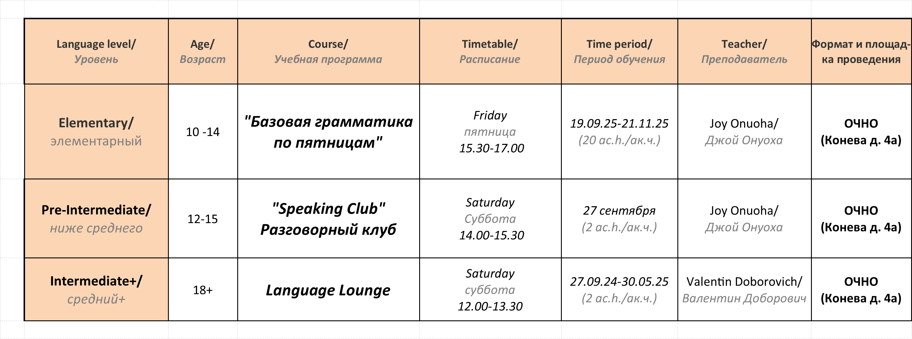 Расписание корректируется по мере наполнения групп, поэтому если в нашем расписании Вы не нашли для себя подходящего варианта по дням и времени проведения занятий, сообщите нам и мы обязательно обсудим все Ваши пожелания